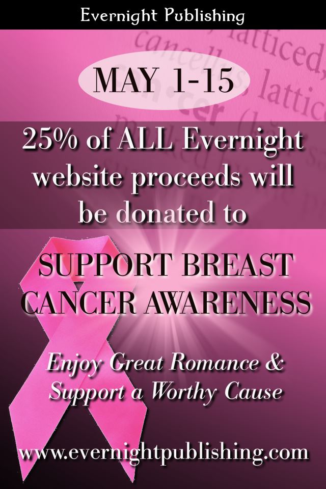 It is such a privilege to be a part of the Evernight Publishing family. I have been so impressed with their operation. And now they are offering 25% of their website proceeds to go to breast cancer awareness! Awesome, I say… just awesome!