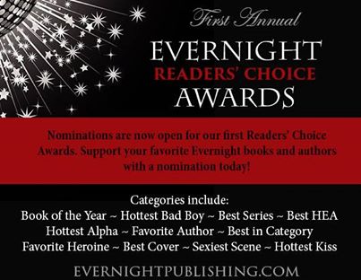 First up is the First Annual Evernight Publishing Reader’s Choice Awards! As an EP author, this is super exciting! What better way for the readers to show their love for the favorite authors then by nominating! There are multiple categories to nominate your favorite book, author, hero, etc. Take a few moments and cast your vote! Us authors would so greatly appreciate it! š You have until the 15th to make your nominations. Finalists will be chosen and then the voting actually begins. This is your chance to have your say! Have at it! š